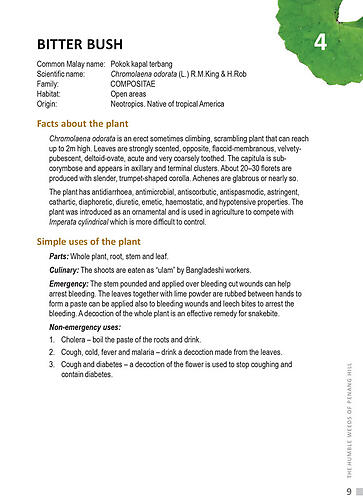 This little book demonstrates the usefulness of these weeds in our daily life. In traditional medicine they have been used to treat many things, including injuries from bleeding wounds to the venomous bites of snakes, scorpions, centipedes, and the stings of bees and wasps.